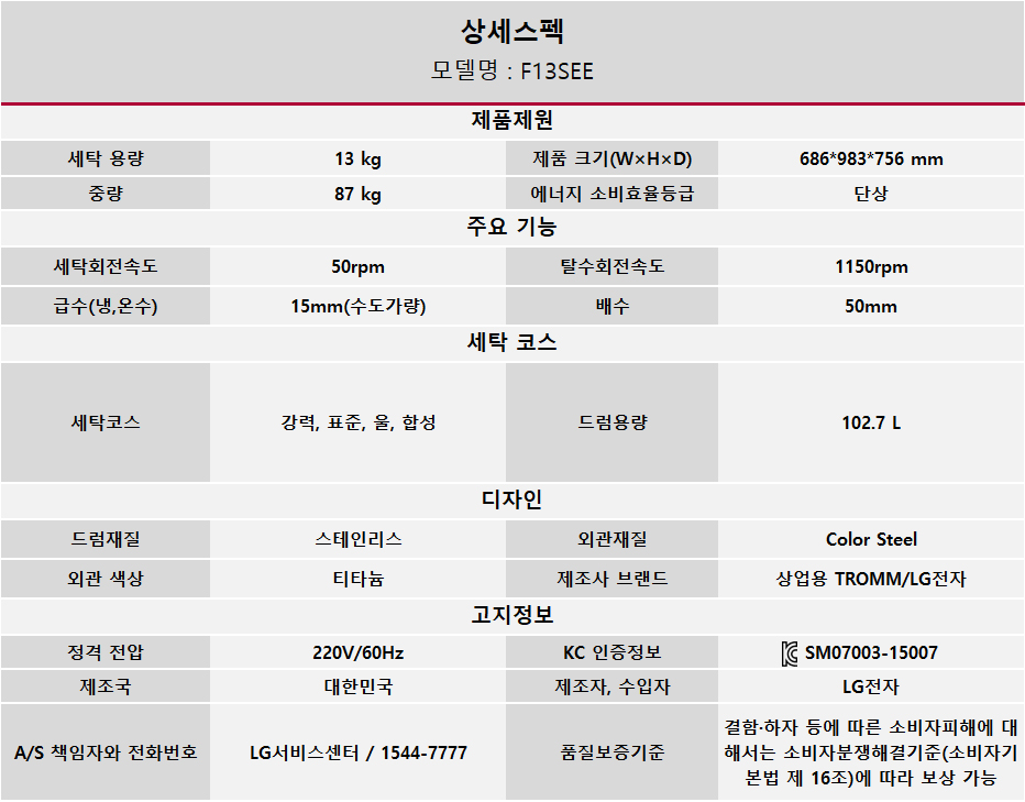 LG 트롬 상업용 세탁기 13kg (F13SEE)