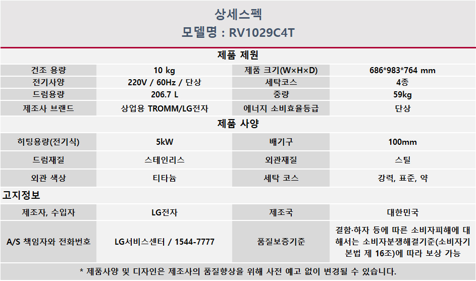 LG 업소용 트롬 전기 건조기 10kg (RV1029C4T)